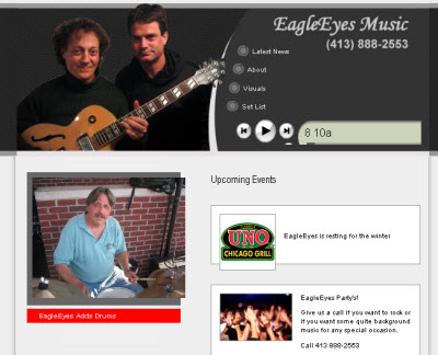 EagleEyesMusic.com is a website I created in 2010 for the band I play in. I like the use of Wimpy player which allow for the streaming of our music. What is especially nice is that the player and setup works nicely on my cell phone. I used frames to divide the site in half and the top frame fits nicely into most hand-held devices. I use the droid OS and have no problems. |