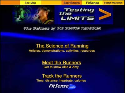 Testing the Limits was created for the Harvard Astrophysics Department which funds SportsSmarts. Their goal is to use sports as an introduction to science and they act as consultants on WBZ's coverage of the Boston Marathon for which this companion page was made. I acted as the project director and worked closely with WBZ-TV, SportsSmarts and FitSense to coordinate this site. I was also the graphics designer responsible for the layout, and writer on the Science of Running "Bounce" section. I created three Flash animations that visually demonstrate key concepts which were designed to help viewers connect the readings to real world examples. |