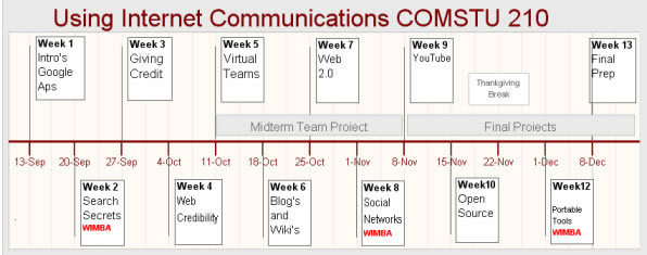 Goals :This course will enhance your understanding of communication options on the Internet, and help you become an effective communicator using internet tools in both your personal and professional lives. The purpose of this course is to enhance your abilities to find information and to communicate effectively using information technologies. You will review basic principles about effective communication generically, and participate in the translation of these principles into electronic forms of communication in interpersonal, small group, and presentational settings. You will apply these guidelines in technological modes, including e-mail, document sharing, internet publishing, discussion forums, blogging, WIKI's, electronic meetings, social networks, and presentation software. Basic web-design principles will be presented, and students will create and publish a personal blog, and a group blog. You will propose and create a final project of your choosing to demonstrate the new knowledge and skills gained in this course. This course does not introduce you to the basics of browsing, emailing, downloading files, etc. It assumes you have these skills already, and builds on them to help you become an expert Internet communicator. If you do not have basic internet skills, you probably should not take this course. |